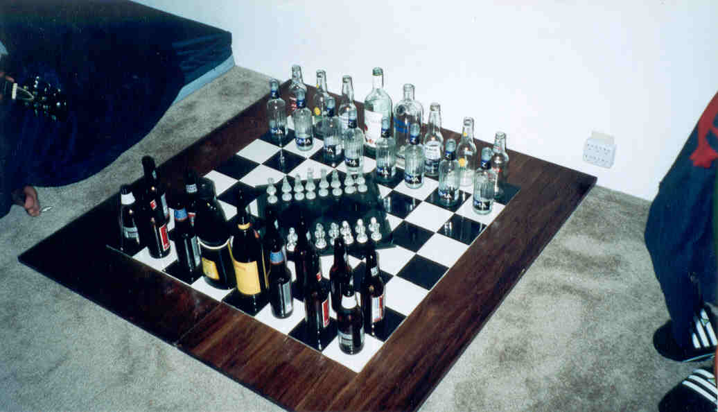 Well, if you think about it, the King and Queen could be like Crown Royal bottles. The knights could be Rolling Rock bottles, seeing that they have horses on them. The pawns can be like cans of Natural Light, because they are the piss water of beer. The Rooks can be 40 oz. bottles of beer, any kind, seeing that both a 40 oz. and a Rook tend to be the towering pieces on the board. It all works out if you know your alcohol.